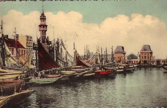 Le port de pêche et la gare maritime. - Gekleurde kaart. - Vissersvaartuigen gemeerd in het eerste handelsdok. Op de achtergrond, het Zeestation. Links, de Vindictivelaan met het Zeevaartcommissariaat, ook de "…