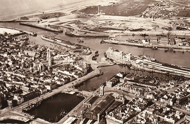 Nels, n° 82. - Vooraan de zeesluis die toegang gaf tot de handelsdokken. Er achter de Visserskreek. In het midden, de Sint Petrus en Pauluskerk met het Sint Petrus en Paulusplein. Linsk, de Vindicitvelaan en rechts, de…
