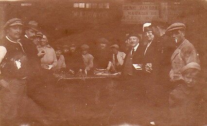 Zwart/wit foto Antony 160834-23. Formaat : 18 x 24 cm. – Groepsfoto genomen tijdens het veilen van langoustines in de oude vismijn (de cirk) voor het pakhuis nr. 30 van Brunet & C° tevens depot van “Sardinerie du…