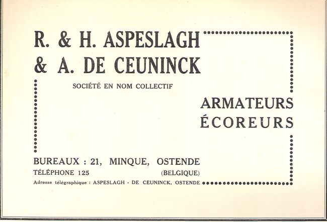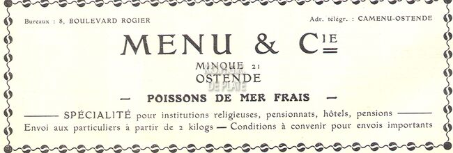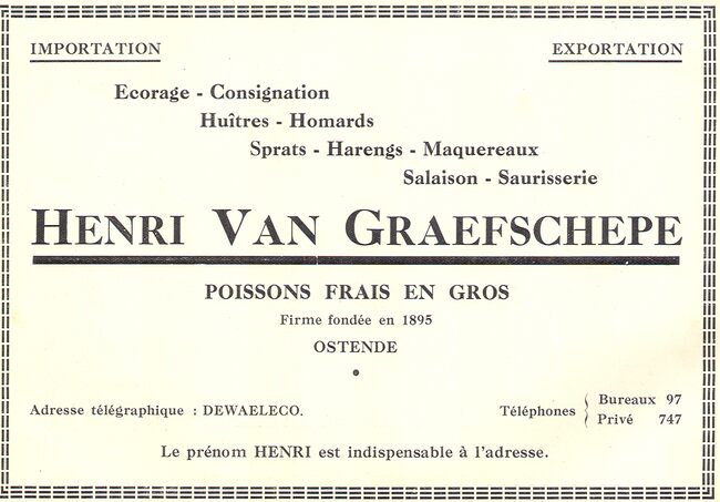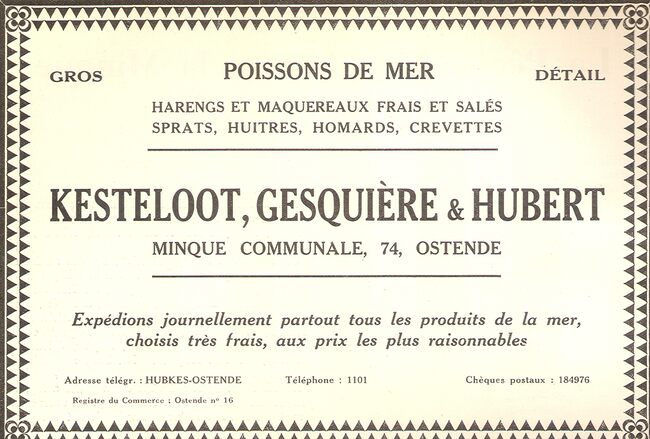 Privé : rue de la Chapelle, 93, Ostende. Firme fondée en 1878. Ecoreur : "A, Dieppe, agent dont la fonction consiste à inscrire toutes les ventes de poisson faites au port, d'en opérer et garantir la livraison, de…
