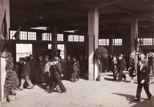 Formaat : 13 x 18 cm. - Notabelen bij een bezoek aan de Vismijn, hier in de Haringmijn. Foto waarschijnlijk genomen tijdens de opening van de nieuwe Vismijn op 22 juni 1951