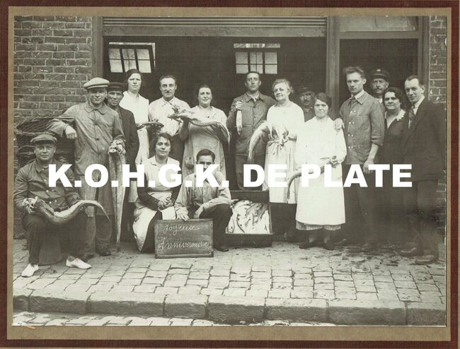 Formaat : 17 x 23,5 cm. - Het personeel van een pakhuis. De foto werd genomen voor een verjaardag (wordt niet vermeld). De meesten onder hen hebben een kabeljauw in de hand.