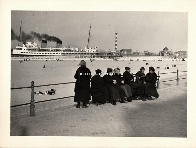 Formaat : 15 x 18 cm. - Groepjes vrouwen rustend op een bank aan het Klein Strand. Een pakketboot in de havengeul, de derde vuurtoren en het quarantainegebouw op de Oosteroever