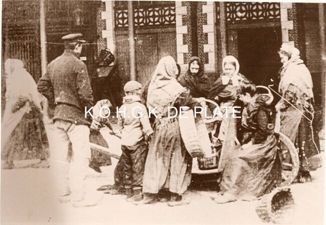 Zwart/wit foto Antony 150525-3. - Formaat : 10,5 x 14,5 cm. Vissersvrouwen nemen een pauze aan een koffiekraam. Ook de hond is van de partij. Links Café “Het British House” uitgebaat door Henri Heinderson-Driesmans,…
