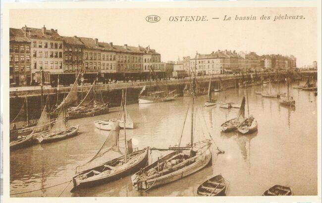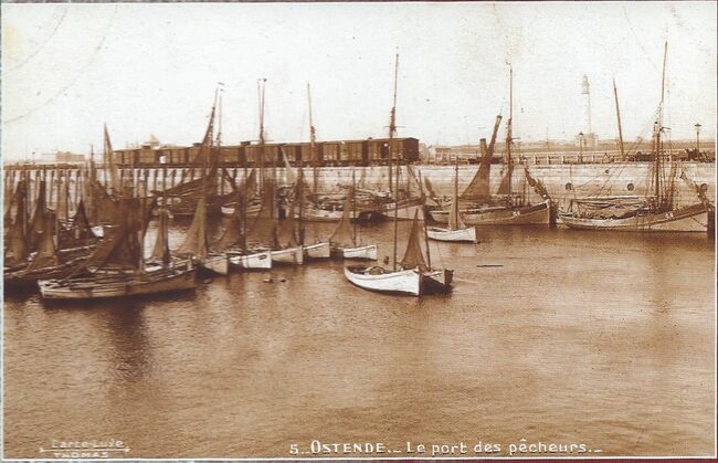 Enkele vissersvaartuigen in het Schuildok en wagons van een vistrein langs de Visserskaai nabij het Vissersplein