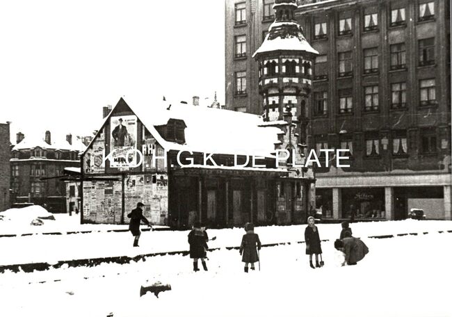 Formaat : 9 x 14 cm. - De overgebleven toren van de vroegere Vleesmarkt, vernield tijdens de Tweede Wereldoorlog. Sneeuwpret op het Mijnplein