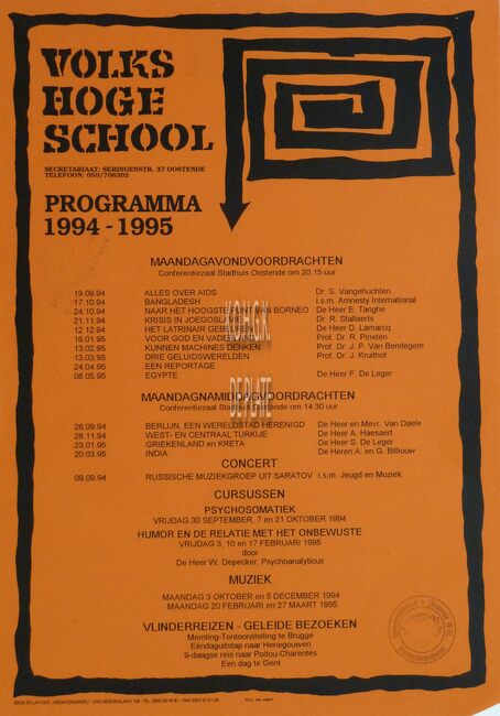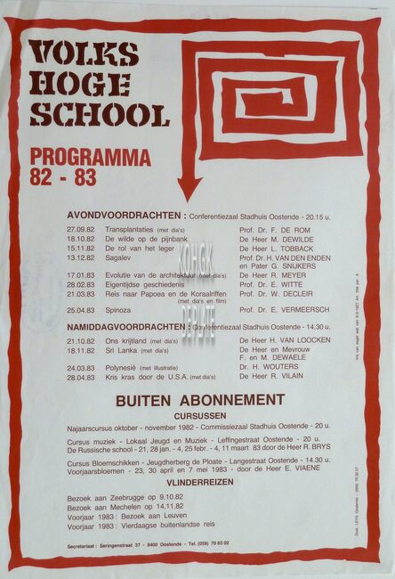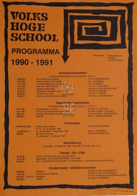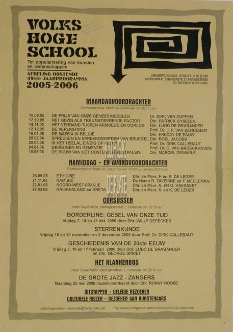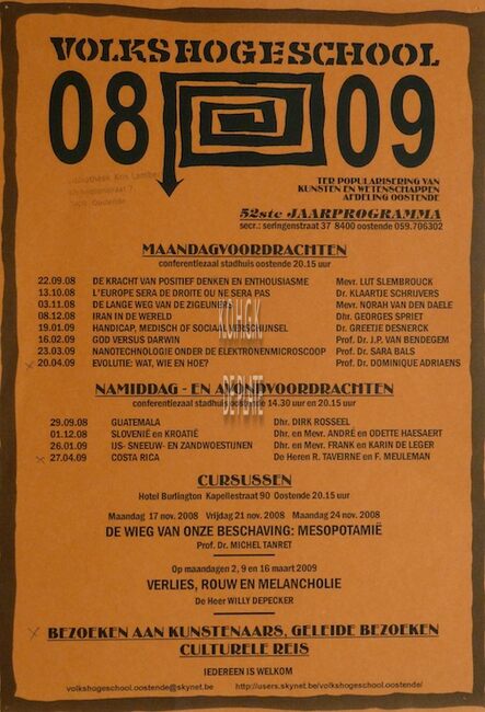 Formaat : 42 x 30 cm. - 58ste jaarprogramma. Maandagavondvoordrachten. Aula Ensorinstituut Oostende 20.15 uur. - 2014 : 15/09 : Kush door Peter De Smet ; 13/10 : Leve de vergrijzing door Patrick Deboosere ; 03/11 :…