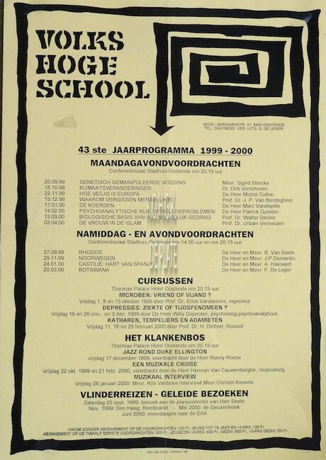 Formaat : 42 x 30 cm. - 63ste jaarprogramma. Maandagavondvoordrachten. Aula Ensorinstituut, Gen. Jungluthlaan 4 Oostende 20 uur. 2019 : 23/09 : Waarom spreken over mensenrechten ? door Greet Van Dael ; 07/10 :…