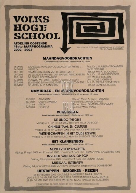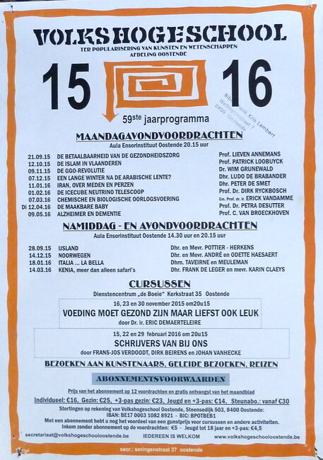 Formaat : 42 x 30 cm. - 66ste jaarprogramma. Maandagavondvoordrachten. Aula Ensorinstituut, Gen. Jungbluthlaan 4, Oostende 20 uur. 2022 : 12/09 : Levensmoeheid door Luc Proot ; 17/10 : Consumeren als konijnen door…