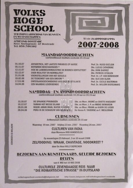 Formaat : 42 x 30 cm. - 62ste jaarprogramma. Maandagavondvoordrachten. Aula Ensorinstituut Oostende 20 uur. 2018 : 10/09 : Omhels de zee... voor het te laat is door Colin Janssen ; 08/10 : Haalt het stakingsrecht…
