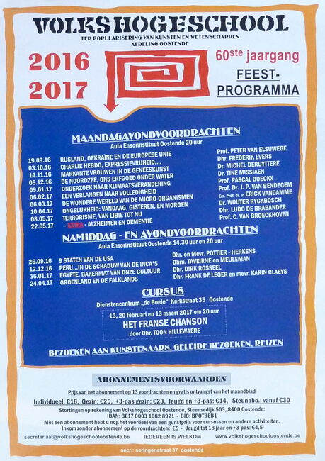 Formaat : 42 x 30 cm. - 60ste jaargang. Feestprogramma. Maandagavondvoordrachten. Aula Ensorinstituut Oostende 20 uur. 2016 : 10/09 : Rusland, Oekraïne en de Europese Unie door Peter Van Elsuwege ; 03/10 : Charlie…