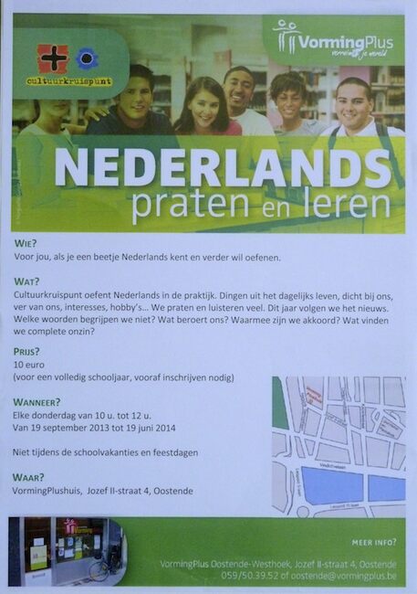 Affiche : Vormingplus. Nederlands praten en leren. Vormingplushuis Oostende. Elke donderdag van 19/09/2013 tot 19/06/2014.