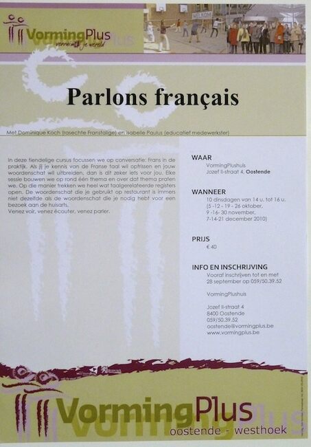 Affiche : VormingPlus. Parlons français. VormingPlushuis. 5-12-19-26 oktober, 9-16-30 november, 7-14-21 december 2010.