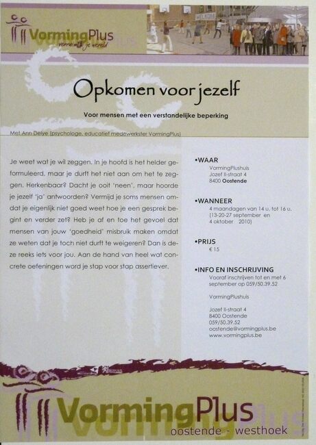 Affiche : Vormingplus. Assertiviteit, een opfrissing. VormingPlushuis. 12-19-26/10 en 9/11/2009