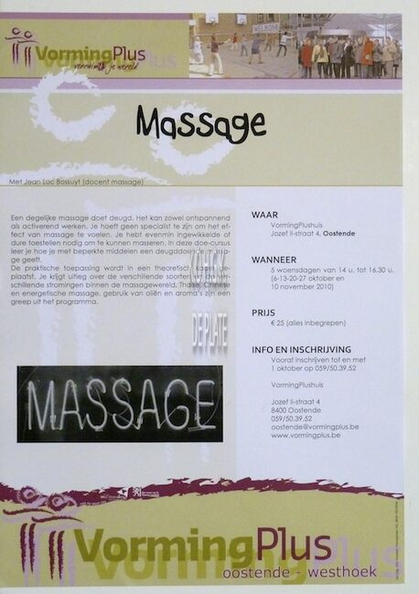 Affiche : VormingPlus. Massage. VormingPlushuis. 6-13-20-27 oktober en 10 november 2010.