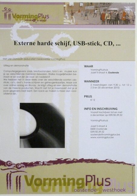 Affiche : VormingPlus. Externe harde schijf, USB-stick, CD, ... VormingPlushuis. 13/12 en 20/12/2010.