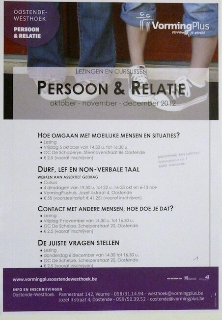 Formaat : 42 x 30 cm. 5/10/2012: Lezing: Hoe omgaan met meoilijke mensen en situaties? 16/10, 23/10, 6/11 en 13/11/2012: Cursus: Durf, lef en non-verbale taal. 9/11/2012: Lezing: Contact met andere mensen, Hoe doe je…