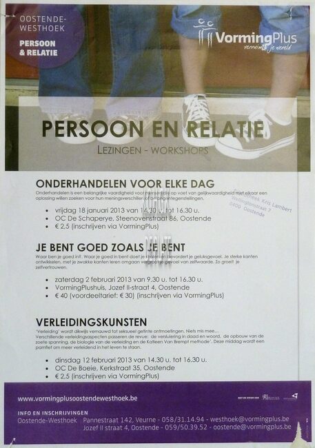 Affiche : Vormingplus. Persoon en relatie : lezingen, workshops. Verscheidene locaties. 01 en 02/2013