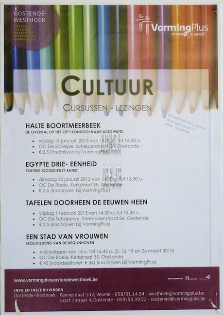 Affiche : VormingPlus. Cultuur : lezingen en cursussen. Oostende. januari - februari - maart 2013.