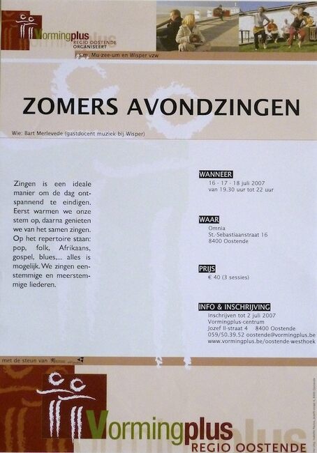Affiche : Vormingplus. Zomers avondzingen. Omnia (Sint-Sebastiaanstraat 16). 16/07, 17/07 en 18/07/2007.