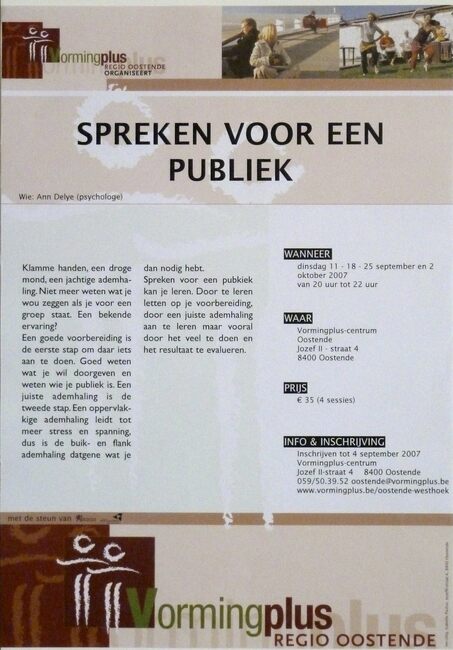 Affiche : Vormingplus. Spreken voor een publiek. Vormingplus Centrum (Jozef II-straat 4). 11-18-25/09 en 2/10/2007