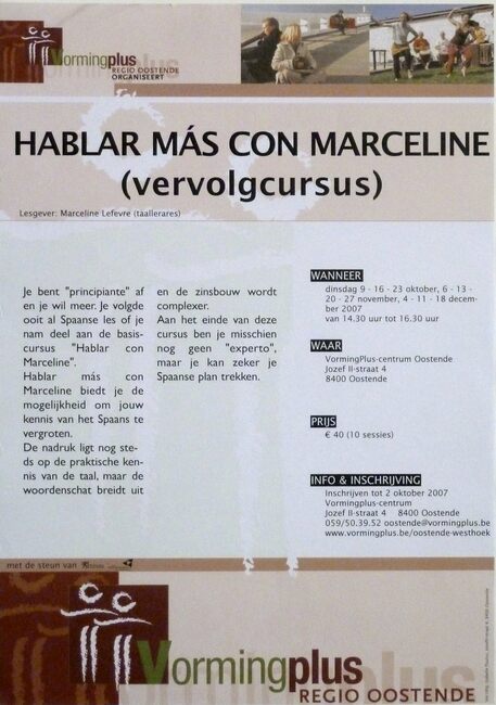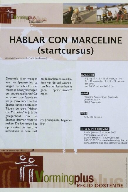 Affiche : Vormingplus. Hablar con marceline (startcursus). Vormingplus Centrum Oostende (Jozef II-straat 4). 12, 19, en 26/10, 9, 16, 23, 30/11 en 7, 14, en 21/12/2007.