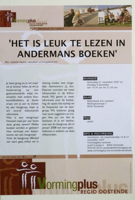 Affiche : Vormingplus. Het is leuk te lezen in andermans boeken. Bibliotheek Kris Lambert. 21/11 en 4/12/2007