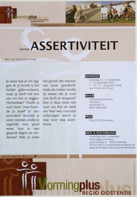 Affiche : Vormingplus. Assertiviteit. Ontmoetingscentrum "De Boeie" Oostende. 12 en 19/11, 3 en 10/12/2007, 7, 14, 21 en 28/01/2008.