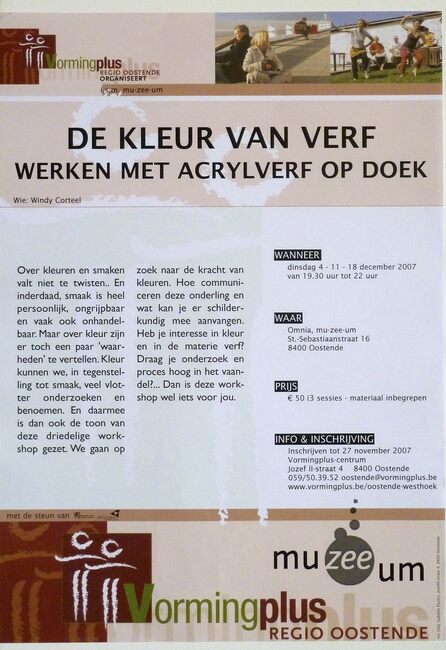 Affiche : Vormingplus. De kleur van verf : werken met acrylverf op doek. Omnia, mu-zee-um (Sint-Sebastiaanstraat, 16). 4, 11 en 18/12/2007