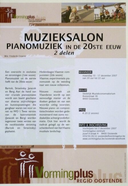 Affiche : Vormingplus. Muzieksalon pianomuziek in de 20ste eeuw (2 delen). Stedelijk Muziekconservatorium Oostende. 10 en 17/12/2007.