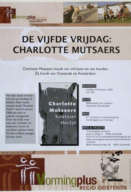 Affiche : Vormingplus. De vijfde vrijdag : Charlotte Mutsaers. Bibliotheek Kris Lambert. 29/02/2008