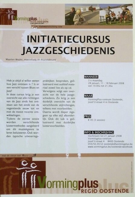 Affiche : Vormingplus. Initiatiecursus jazzgeschiedenis. Vormingplus Centrum Oostende (Jozef II-straat 4). 3x maandag 28/01, 11/02 tot 18/02/2008.