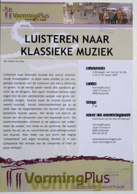 Affiche : Vormingplus. Luisteren naar klassieke muziek. VormingPlushuis. 3/03, 10/03, 17/03, 20/03/2009.