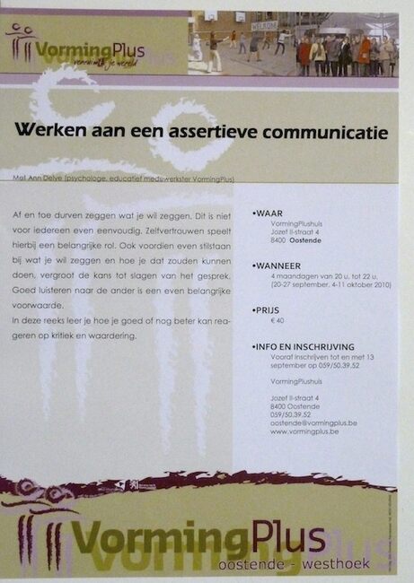 Affiche : VormingPlus. Werken aan een assertieve communicatie. VormingPlushuis. 20-27 september, 4-11 oktober 2010.