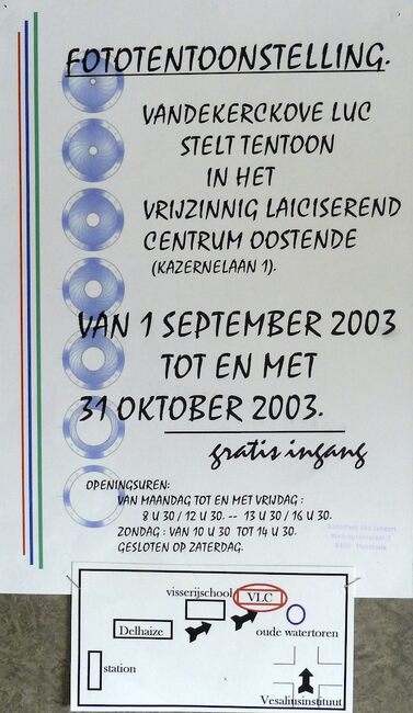 Affiche : Vandekerckhove Luc. Fototentoonstelling. Vrijzinnig Laiciserend Centrum Oostende. Van 1 september tot 31 oktober 2003.
