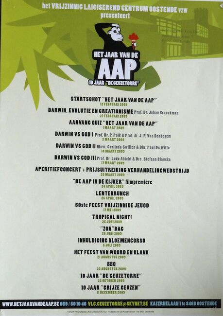 Affiche : VLC Oostende. Het jaar van de aap, 10 jaar 'Geuzetorre'. VLC De Geuzetorre. 12-27/02, 1-3-10-17-29/03, 24-26/04, 17/05, 26-28/06, 5/07, 21-23/08, 23/10 en 11/12/2009