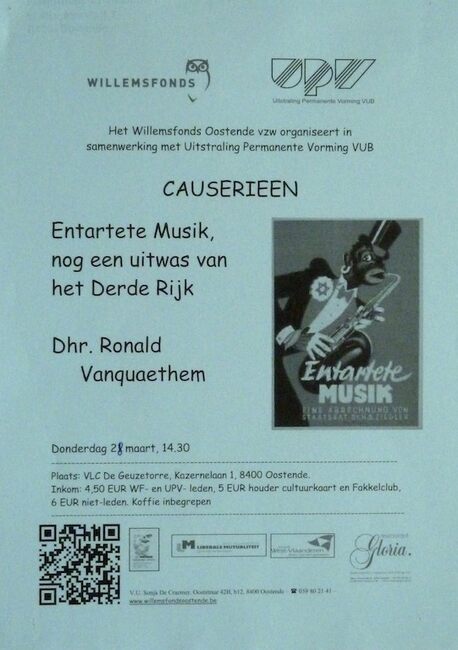 Affiche : Willemsfonds. Causerieen : Entartete Musik, nog een uitwas van het Derde Rijk. VLC De Geuzetorre. 28/03/....(?)