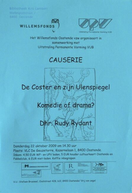 Affiche : Willemsfonds. Causerie : De Coster en zijn Ulenspiegel, komedie of drama?. VLC De Geuzetorre. 22/10/2009