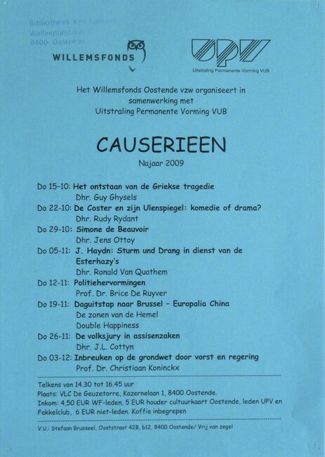 Affiche : Willemsfonds. Causerieen najaar 2009. VLC De Geuzetorre. 15/10 tot 3/12/2009