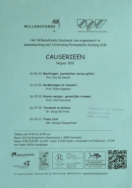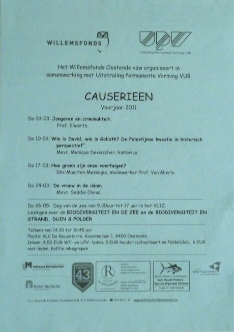 Affiche : Willemsfonds. Causerieen voorjaar 2011. VLC De Geuzetorre. 3/3 tot 24/3 en 26/5/2011