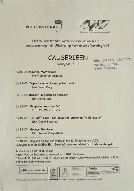 Affiche : Willemsfonds. Causerieen voorjaar 2012. VLC De Geuzetorre. 16/2 tot 22/3/2012