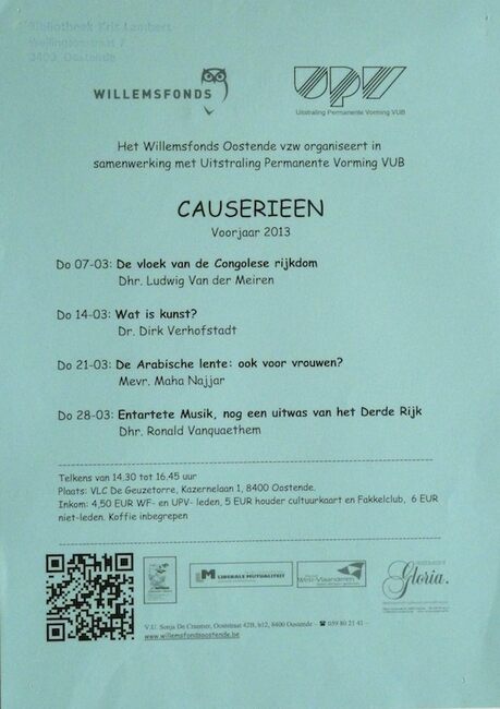 Affiche : Willemsfonds. Causerieen voorjaar 2013. VLC De Geuzetorre. 7/3 tot 28/3/2013