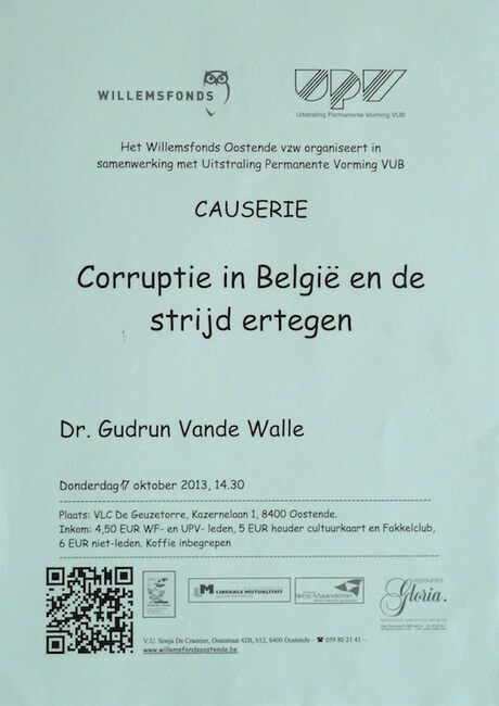 Affiche : Willemsfonds. Causerie : Corruptie in België en de strijd ertegen. VLC De Geuzetorre. 17/10/2013