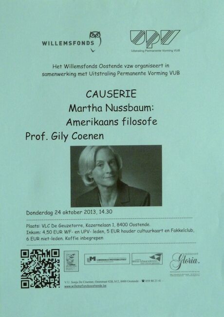 Affiche : Willemsfonds. Causerie : Martha Nussbaum : Amerikaans filosofe. VLC De Geuzetorre. 24/10/2013