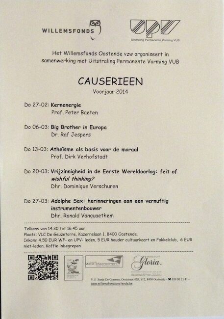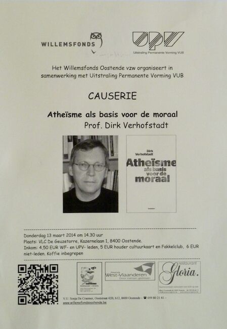 Affiche : Willemsfonds. Causerie : Atheïsme als basis van de moraal. VLC De Geuzetorre. 13/03/2014