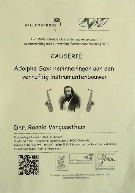 Affiche : Willemsfonds. Causerie : Adolphe Sax : Herinneringen aan een vernuftig instrumentenbouwer. VLC De Geuzetorre. 27/03/2014