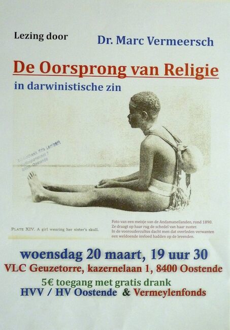 Affiche : Humanistisch Verbond. De Oorsprong van Religie in darwinistische zin. VLC Geuzetorre. 20/03/....(?)