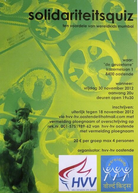 Affiche : Humanistisch Verbond Oostende. Solidariteitsquiz ten voordele van wereldkids Mumbai. De Geuzetorre. 30/11/2012.