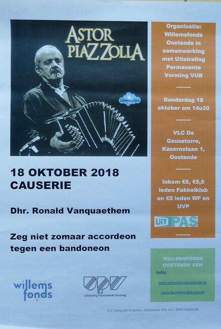 Affiche : Willemsfonds. Astor Piazzolla : causerie. VLC De Geuzetorre. 18/10/2018