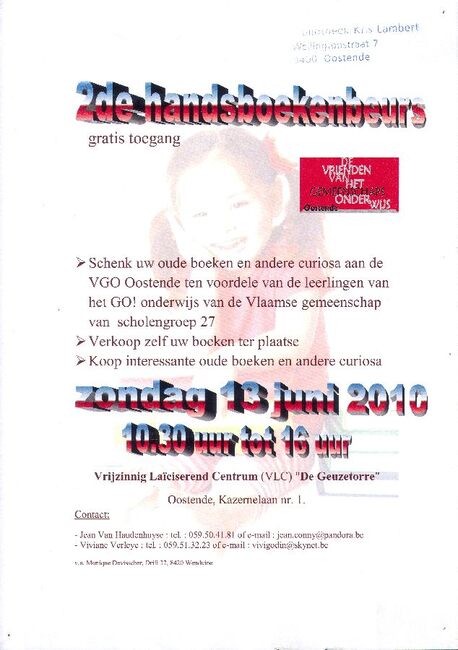 Formaat : 30 x 21 cm. De Vrienden van het Gemeenschapsonderwijs Oostende ; Schenk uw oude boeken en andere curiosa aan de VGO Oostende ten voordele van de leerlingen van het GO! onderwijs van de Vlaamse gemeenschap van…